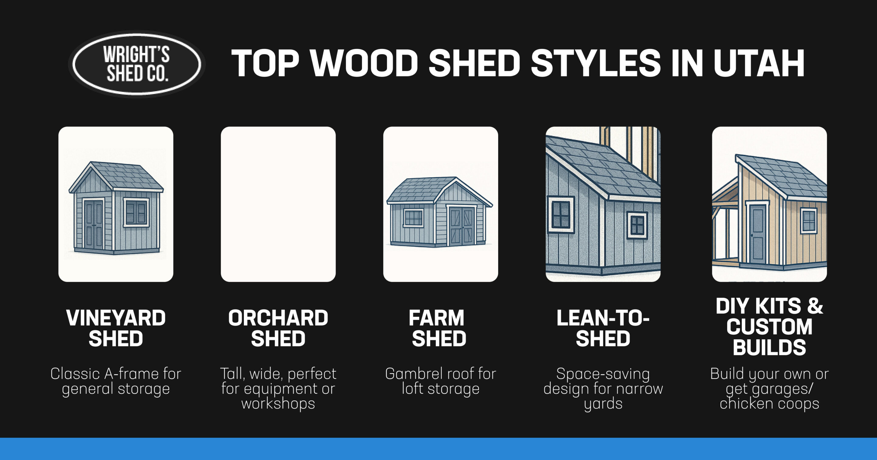 Graphic showcasing popular wood shed styles in Utah, including vineyard, orchard, farm, lean-to sheds, and DIY custom builds.